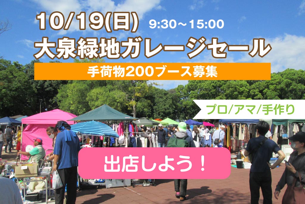 大泉緑地公園<わんぱくランド>で開催。手荷物200ブース。プロ、アマチュア、手作り出店可!