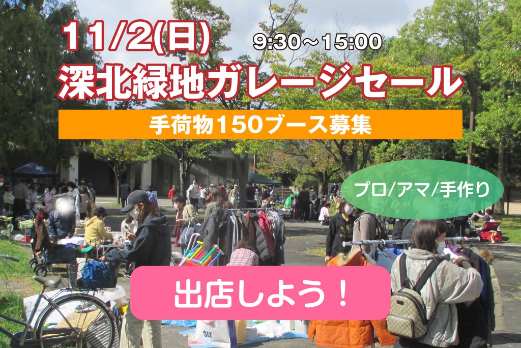 深北緑地公園<第一駐車場横テニスコート前広場>で開催。手荷物150ブース。プロ、アマチュア、手作り出店可!